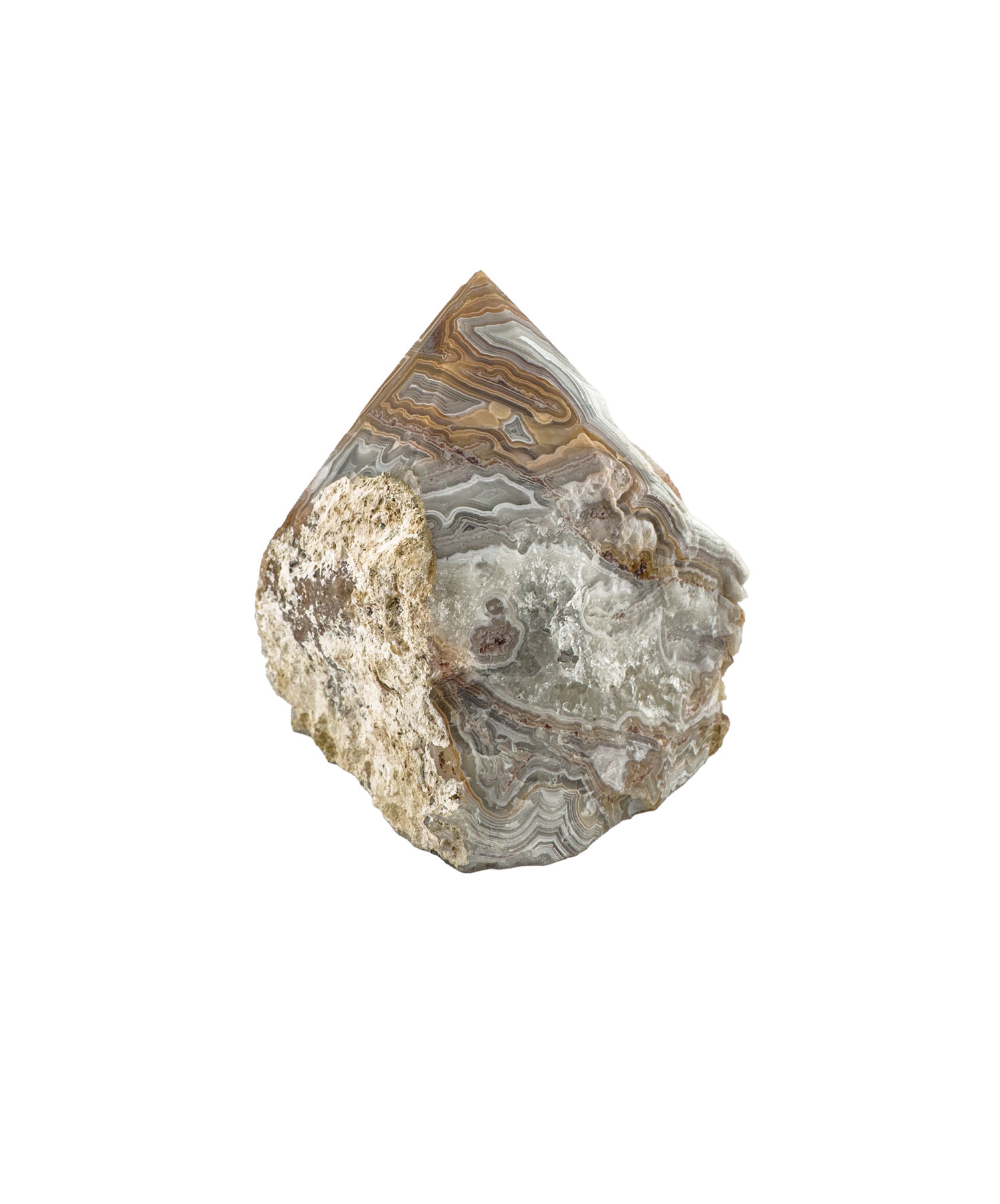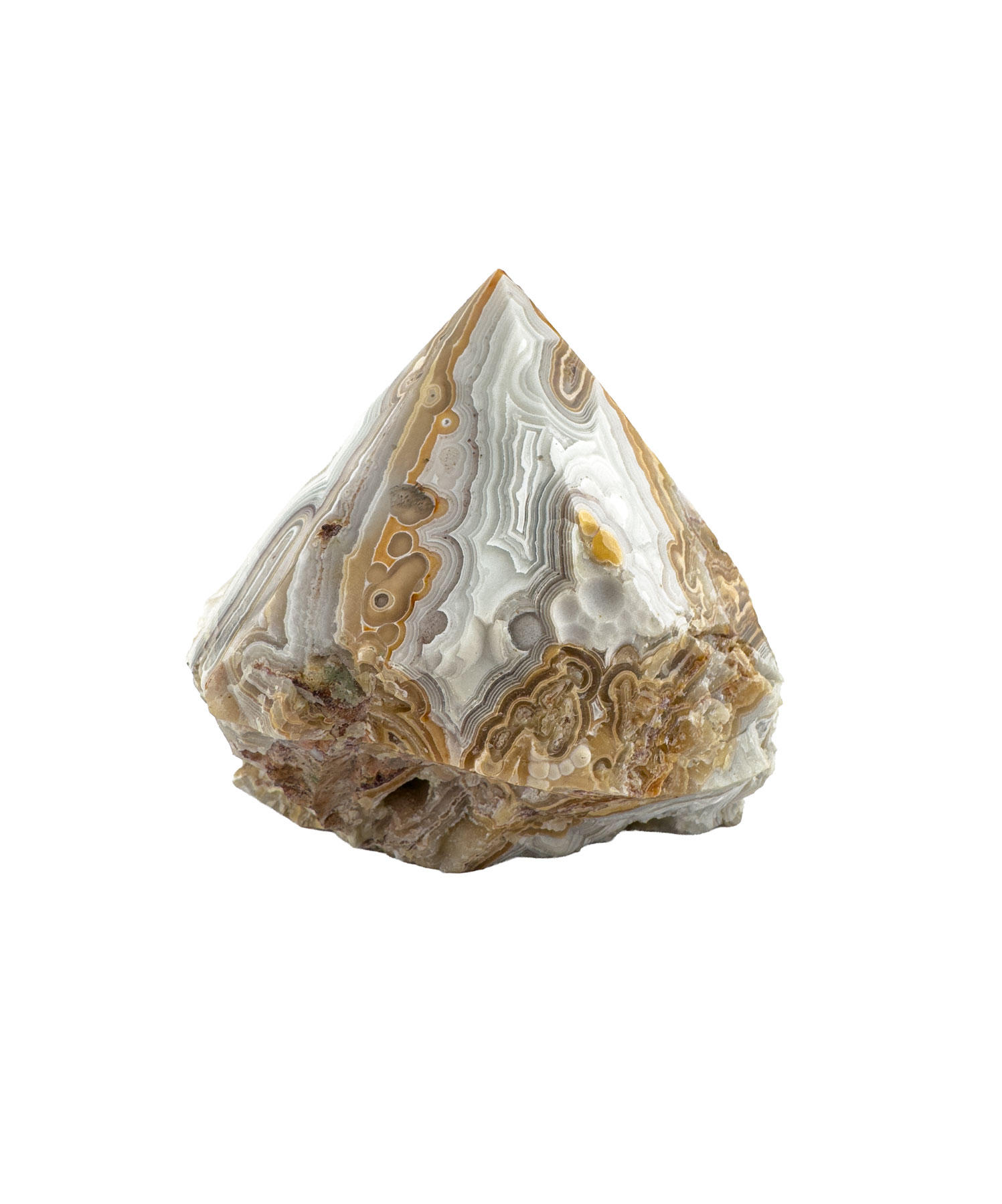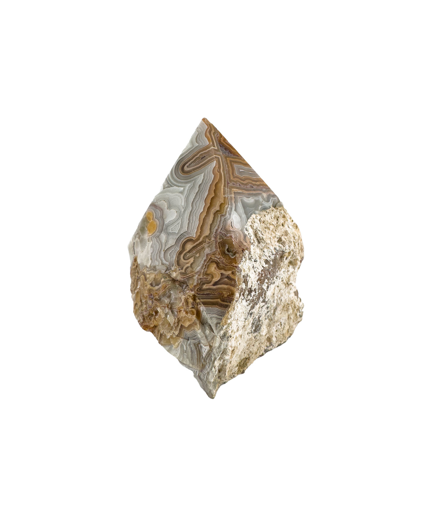 Der Crazy-Lace Achat wird seit Jahrhunderten als „Stein der Freude und Balance“ geschätzt. Er gilt als Begleiter, der emotionale Stabilität verleiht, das innere Gleichgewicht fördert und zugleich Leichtigkeit und Lebensfreude schenkt. In spirituellen Praktiken wird er eingesetzt, um negative Energien abzuleiten und eine harmonische Verbindung zwischen Körper, Geist und Seele herzustellen. Besonders die Mischung aus naturbelassener Basis und geschliffener Spitze symbolisiert die Balance zwischen Ursprünglichkeit und Veredelung.