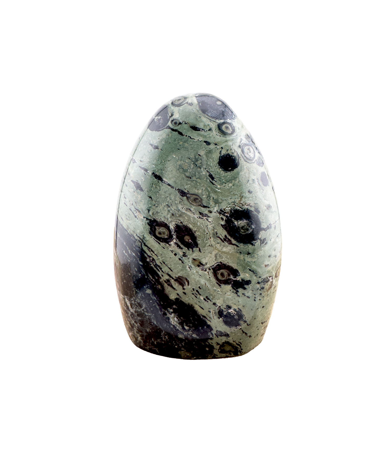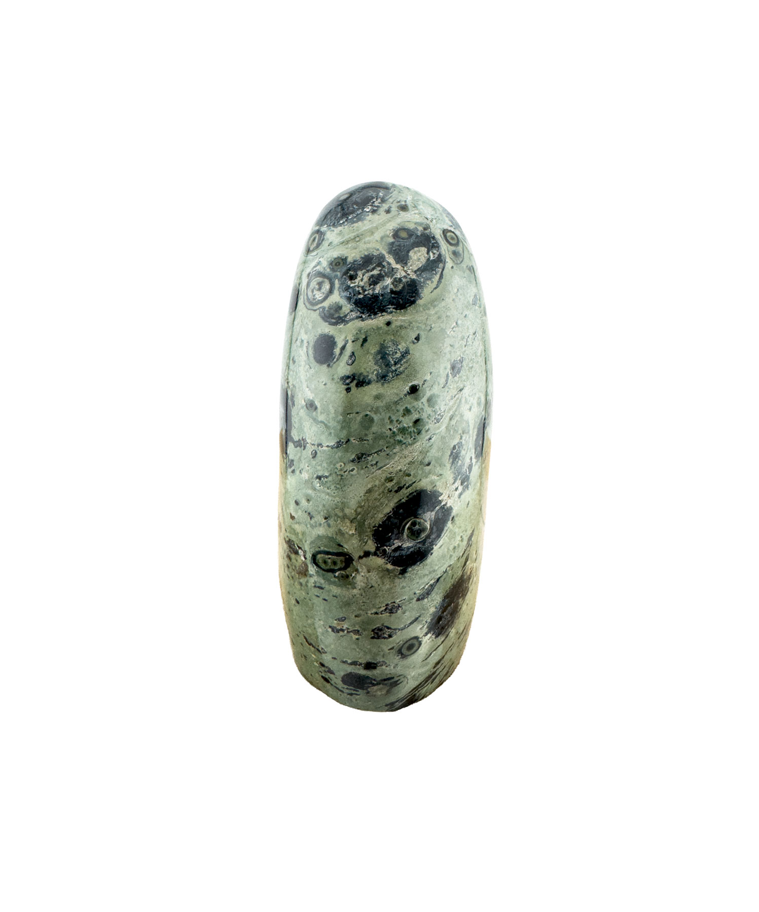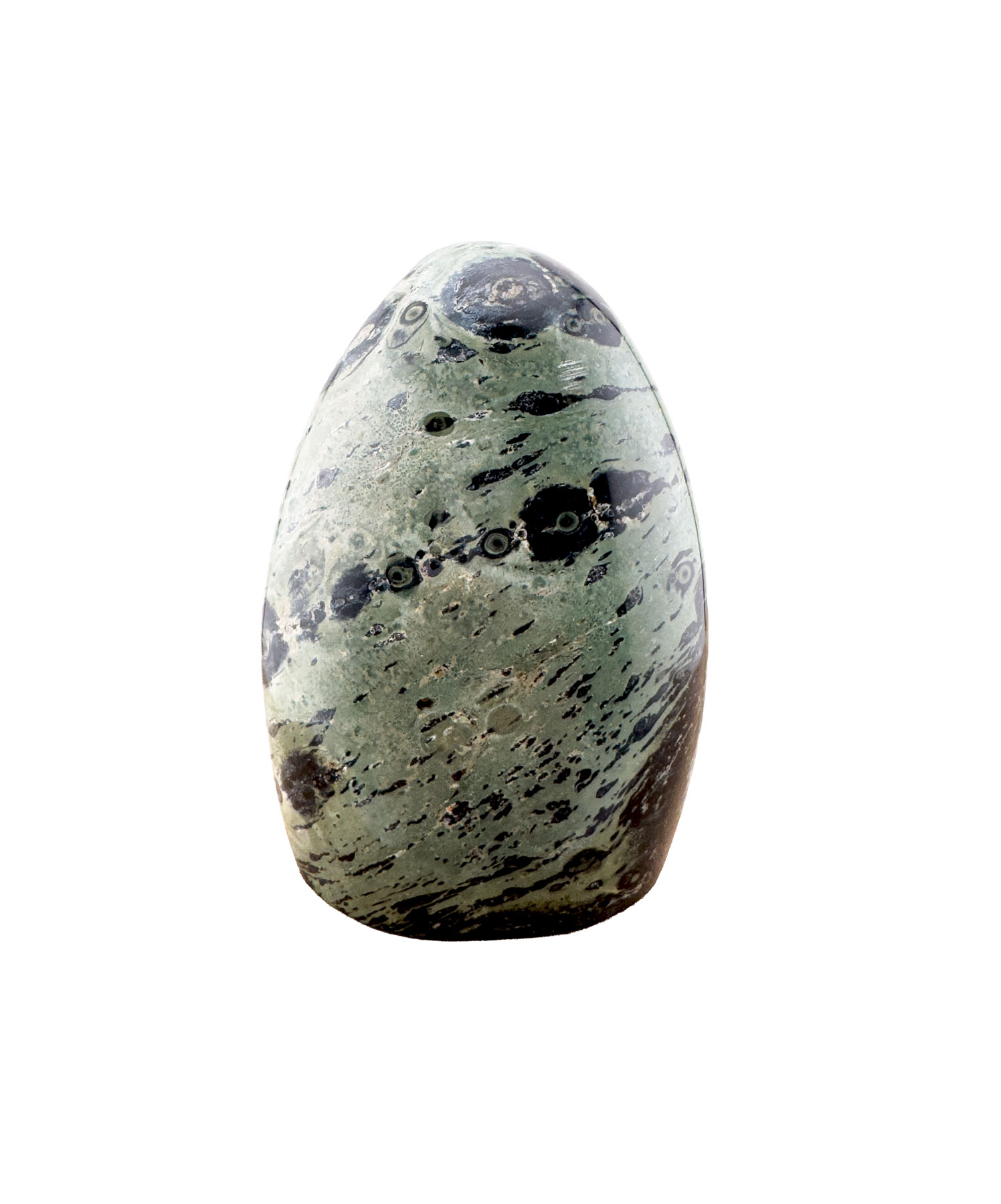 Eldarit besticht durch seine intensive Farbkomposition, die von sanften Grüntönen über warme Erdfarben bis hin zu dunklen Schichten reicht. Diese natürliche Zeichnung wirkt beinahe künstlerisch und macht den Stein sowohl als Sammlerstück als auch als Dekorationselement besonders beliebt.
