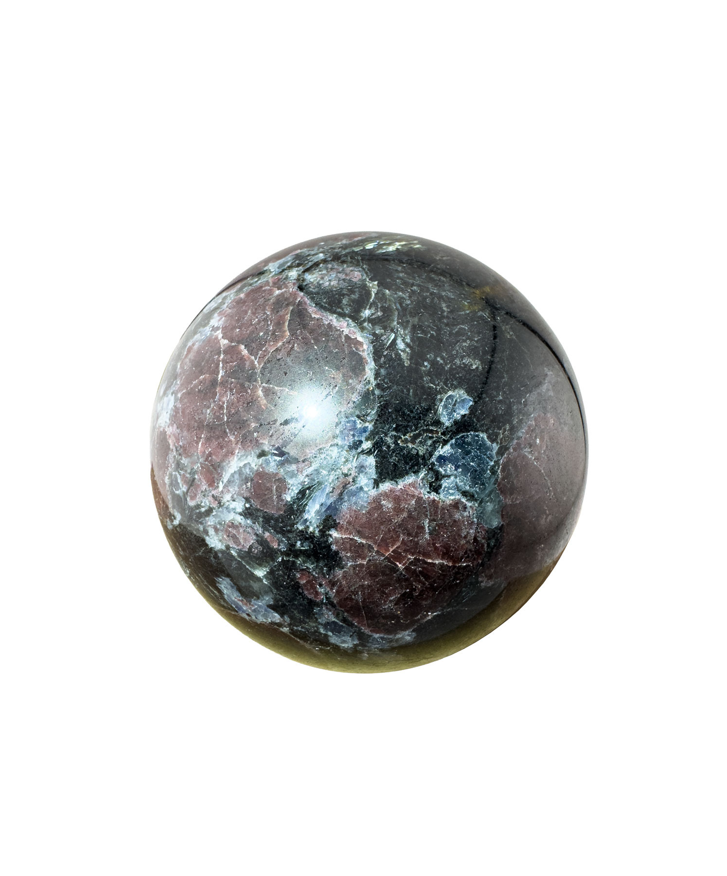 Die Granat Astrophyllit Kugel vereint gleich drei kraftvolle Mineralien: Granat, Astrophyllit und Sodalith. Während der Granat mit seinen tiefroten Schattierungen für Leidenschaft und Vitalität steht, bringt der Astrophyllit mit seinen metallischen Reflexen die Energie der Transformation und spirituellen Entwicklung in das Stück. Kleine Einschlüsse von Sodalith ergänzen das Farbspiel durch intensive Blautöne, die für innere Ruhe und Klarheit stehen.