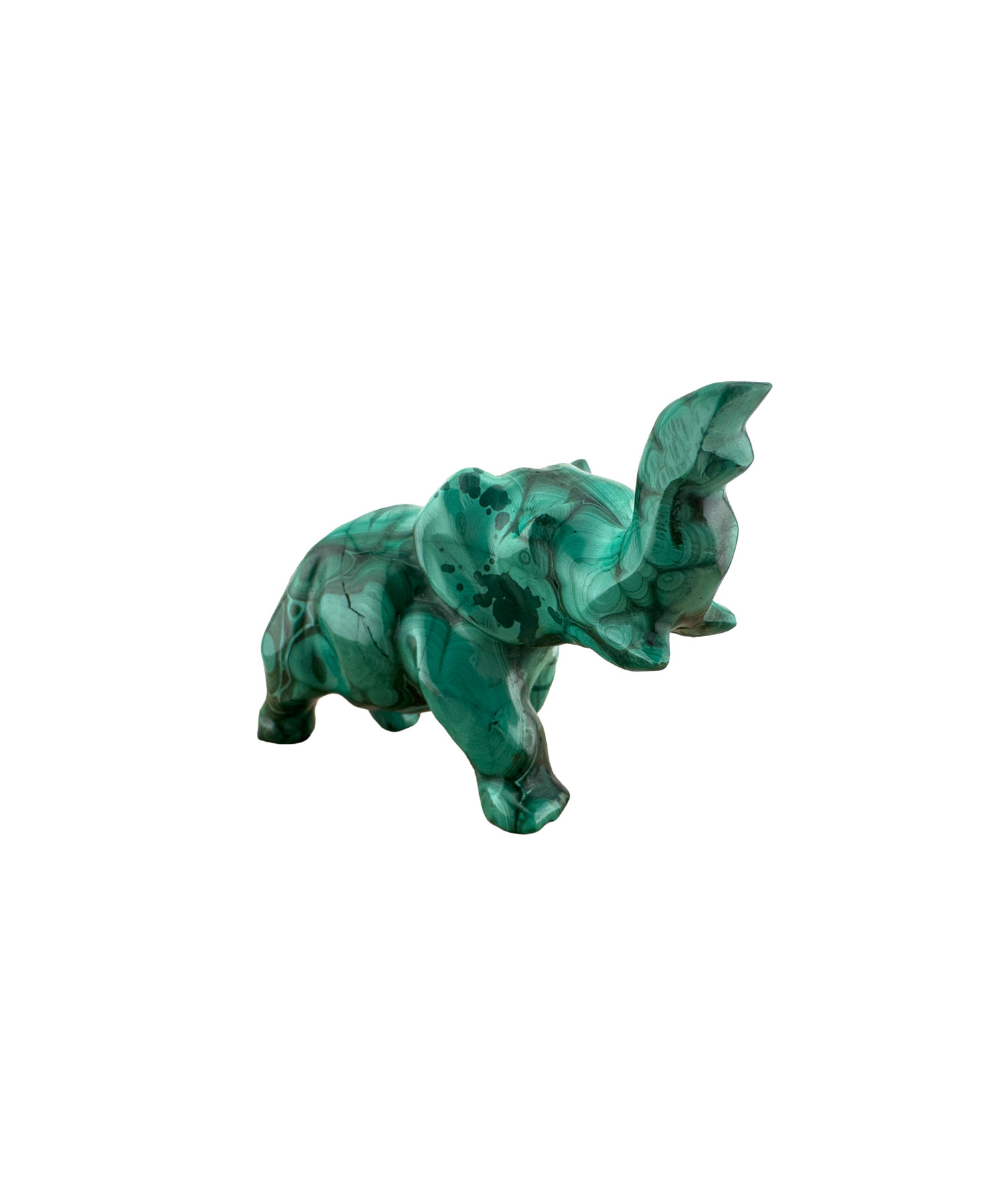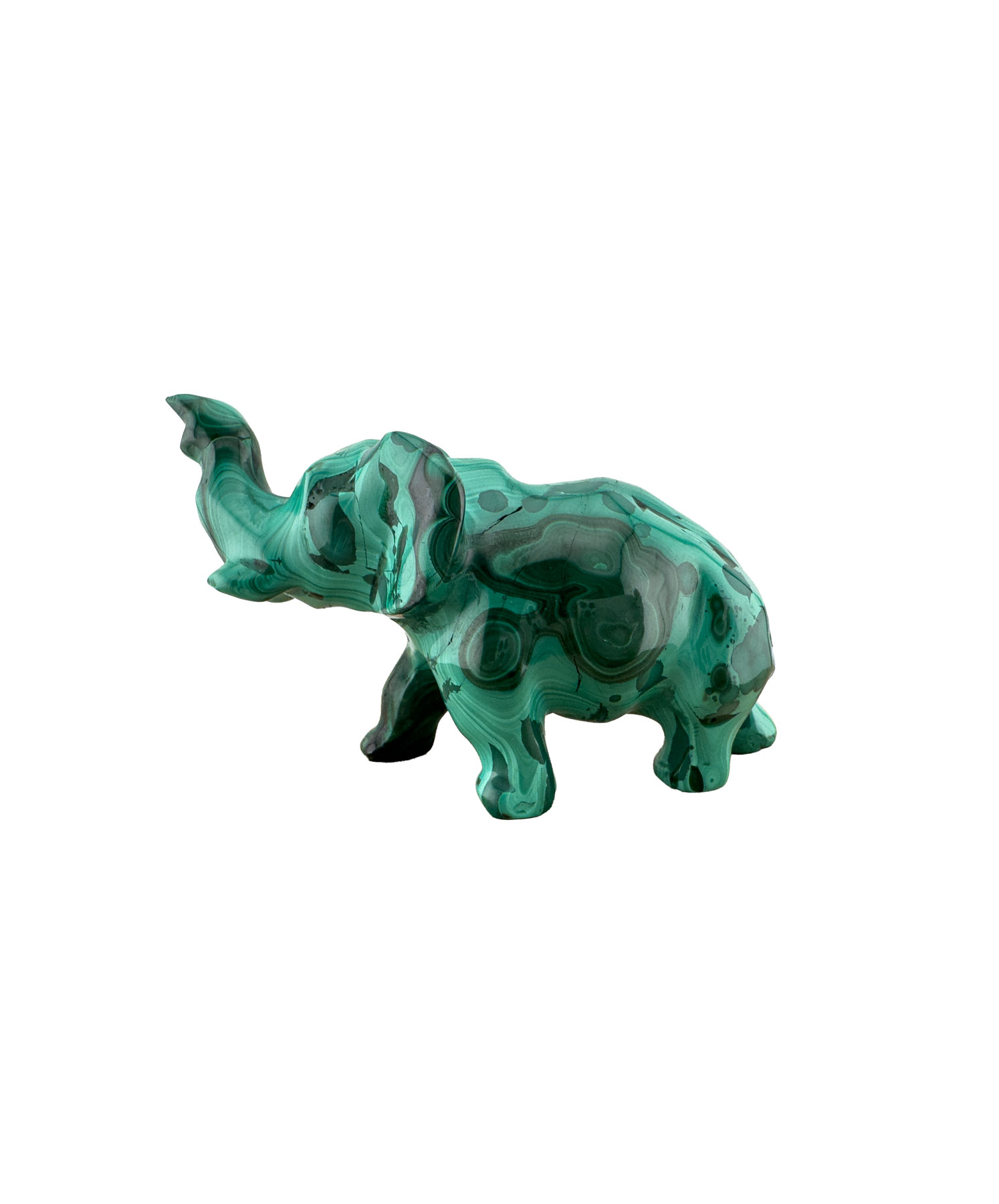 Malachit ist seit der Antike bekannt und geschätzt. Mit seinen intensiven Grüntönen und den markanten Bändern gilt er als einer der eindrucksvollsten Edelsteine. In dieser Elefantenfigur zeigt er sich von seiner schönsten Seite.