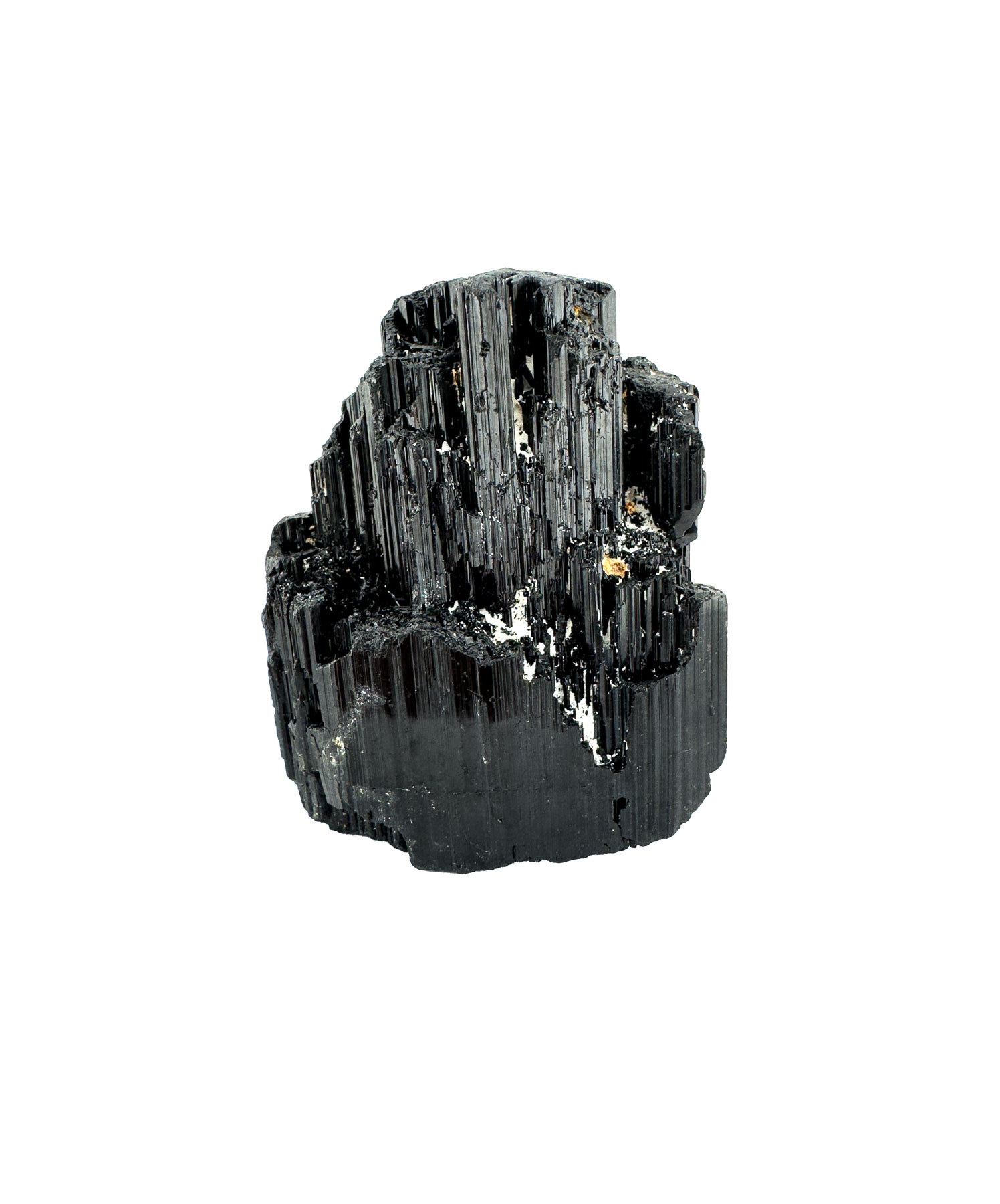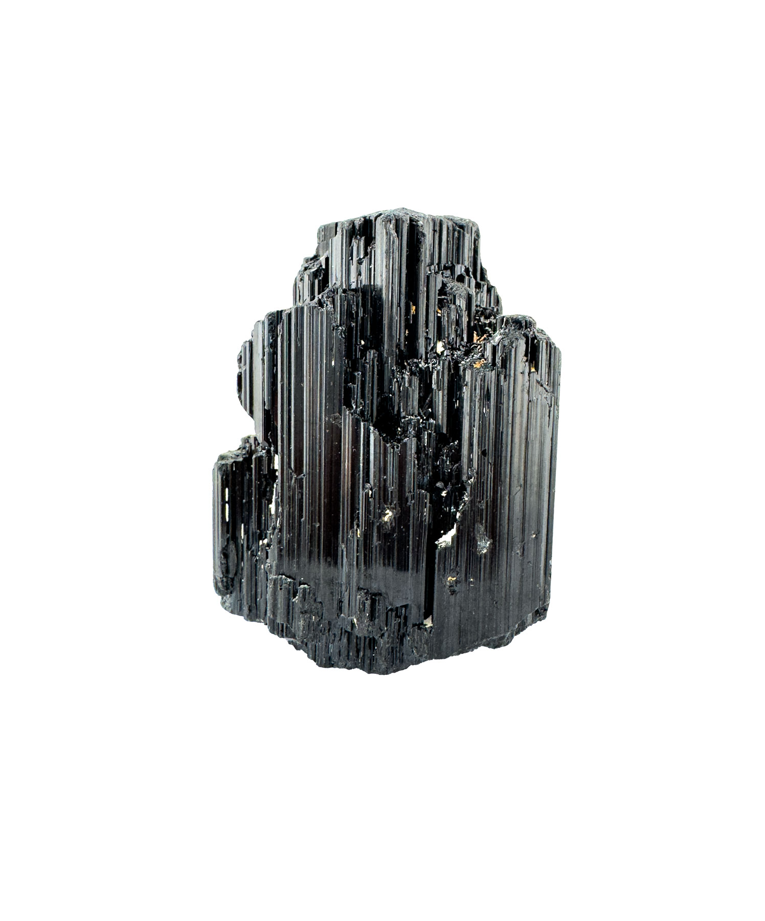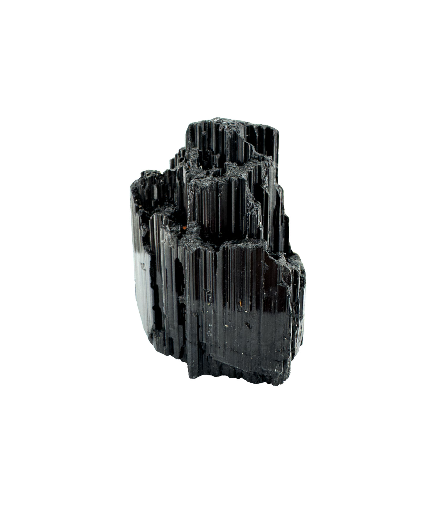 Schwarzer Turmalin Rohstein zeigt eine markante, säulenartige Kristallstruktur mit glänzenden Längsrillen.
